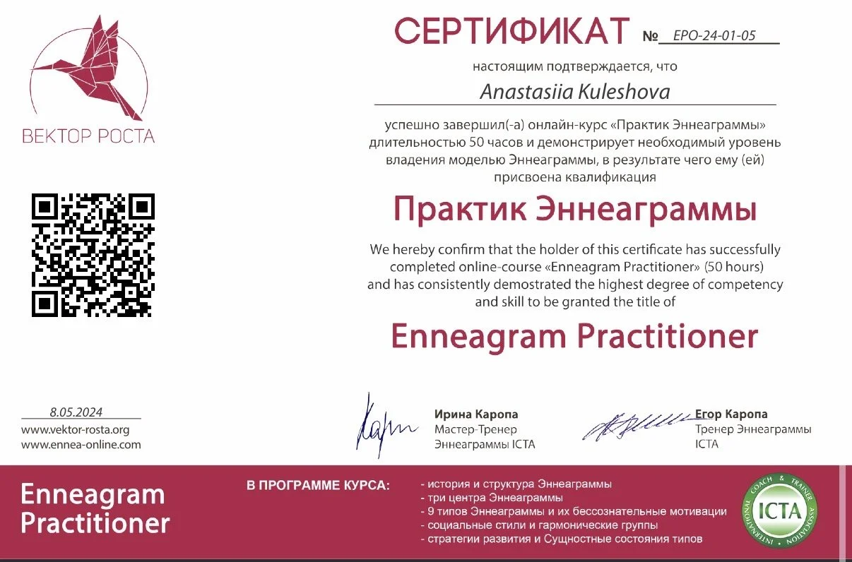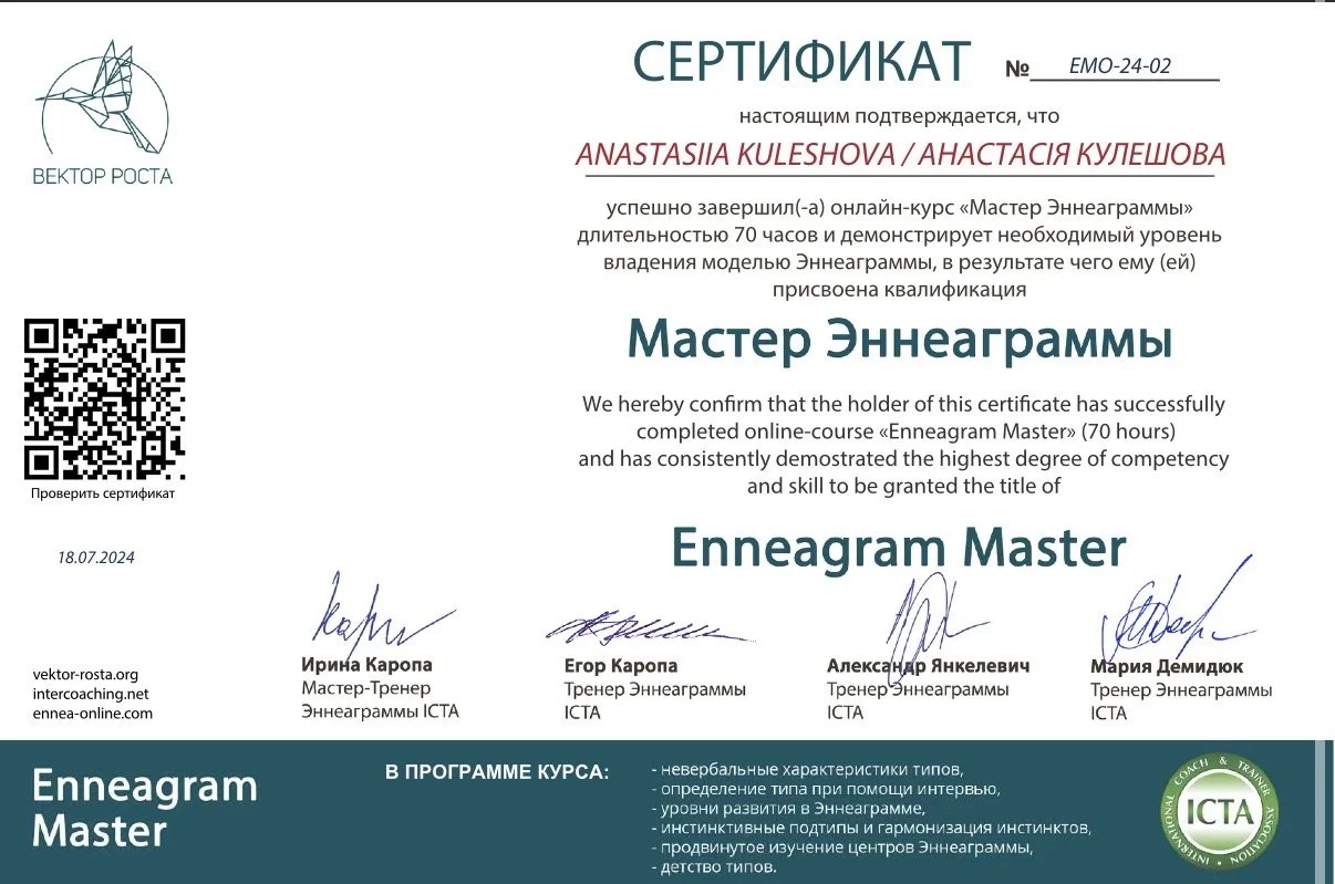 Значительную часть моей практики формирует эннеаграммный подход. Я прошла обучение уровня практик (50 часов) и мастер (70 часов) в школе «Вектор роста» и продолжаю обучение по программе «Эннеаграмма в коучинге». Для меня эннеаграмма - не система ярлыков, а инструмент глубинного понимания мотиваций, защит и внутренних конфликтов человека.
