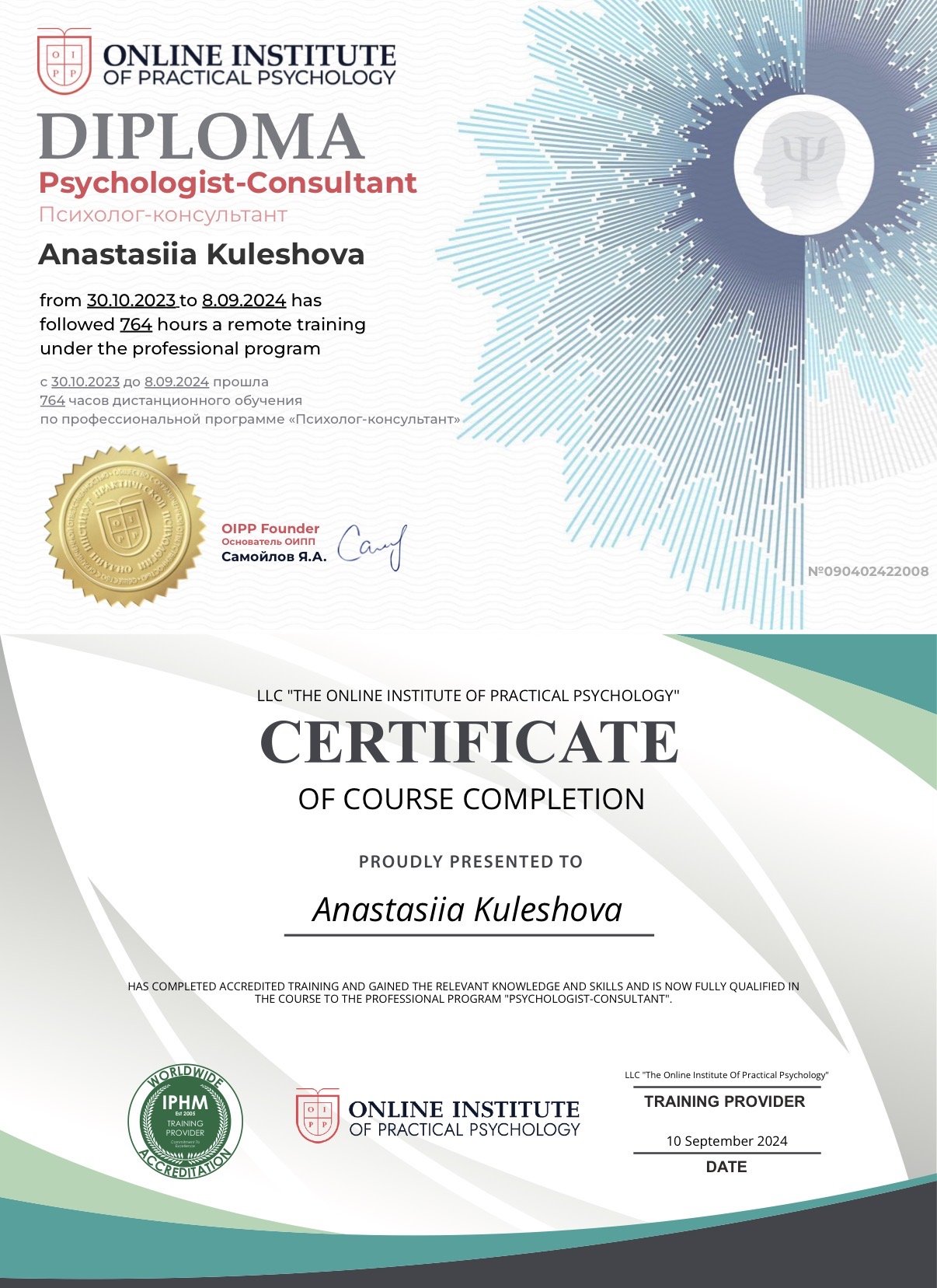 Я получила образование в Online Institute of Practical Psychology, где прошла профессиональную подготовку по программе «психолог-консультант» (764 часа). Этот этап дал мне прочную базу: понимание психологических процессов, этики работы и границ сопровождения.