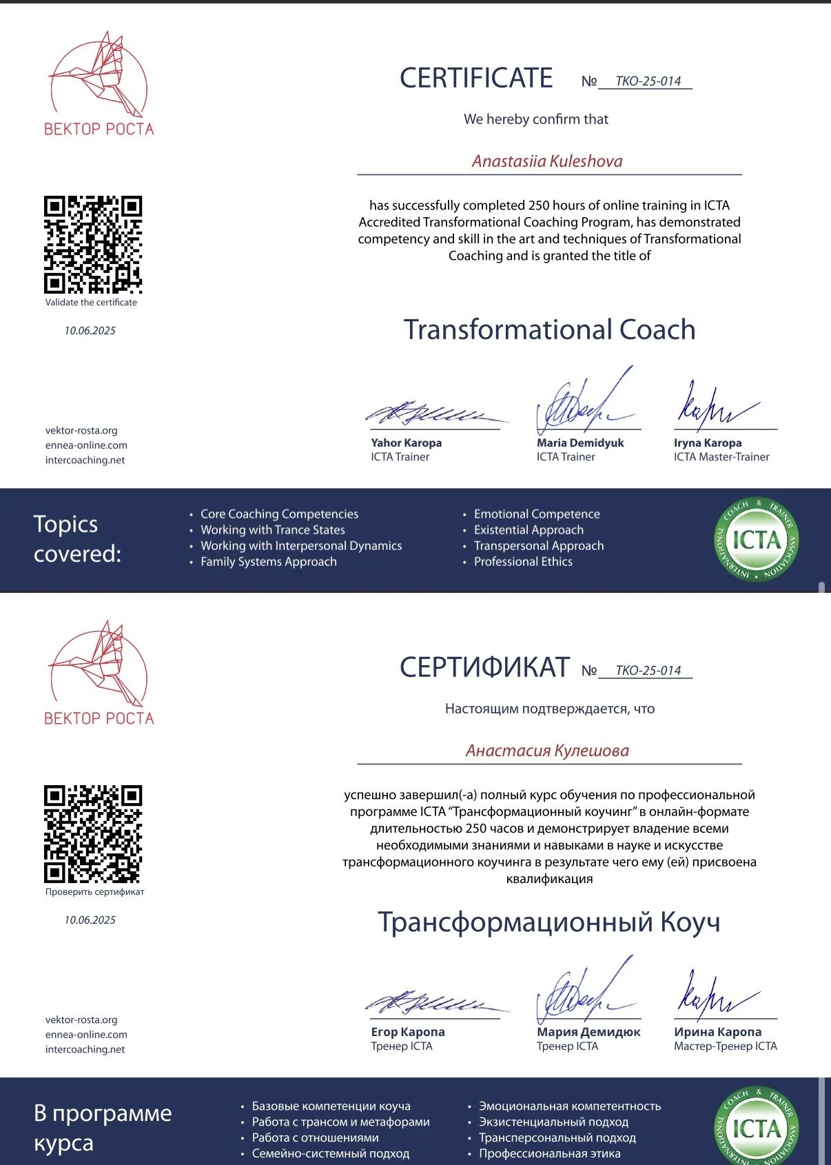 Я также обучалась трансформационному коучингу по стандартам ICTA (International Coach & Trainer Association) (250 часов), где большое внимание уделяется сопровождению изменений без давления, с опорой на внутренние ресурсы клиента.