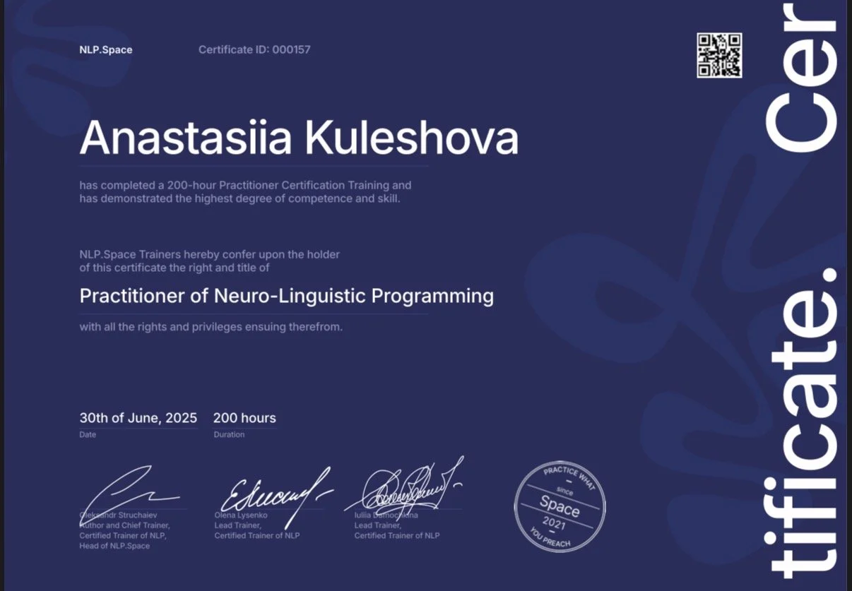 В моей работе присутствуют инструменты НЛП-практика (обучение у Александра Стручаева, 200 часов), которые я использую не как набор техник, а как способ точнее слышать язык человека, его стратегии мышления и способы контакта с реальностью.